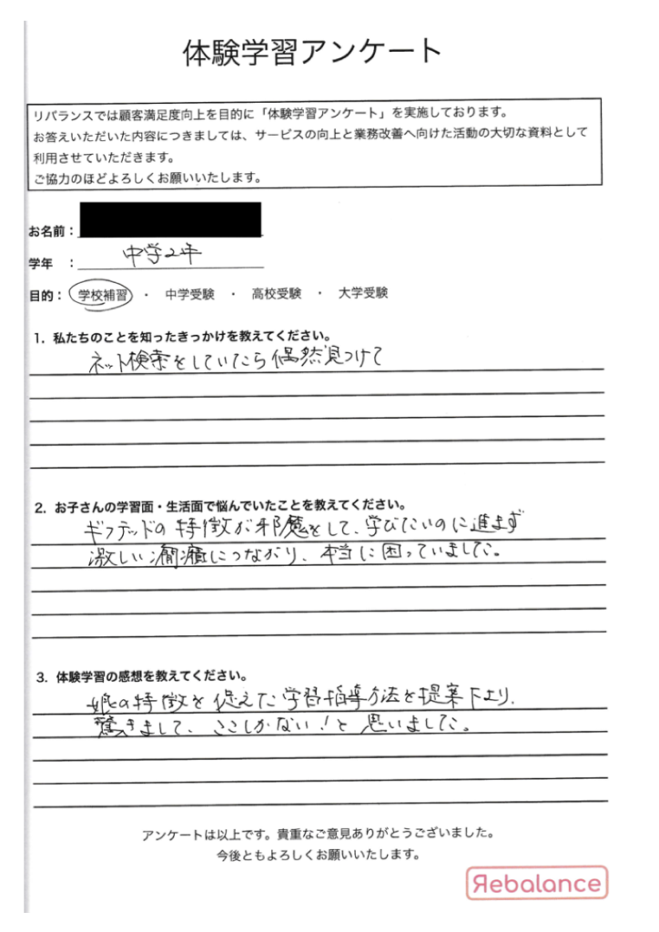 話すことが苦手なので、本人は1対1の個人指導より集団形式の方が良いと言っていたのですが、実際に体験してみたところ、嫌がることなく先生とやり取り出来ていたようで安心しました。発達凸凹の特性を踏まえた指導が本人の学びにプラスになるかもしれないと思いました。